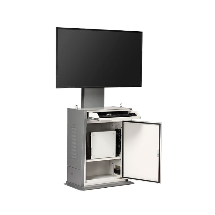 スタンド下部には防塵ラックを搭載しています。大型ディスプレイに接続するパソコンを防塵ラック内に収納することで、ホコリの侵入によるパソコンのトラブルを未然に防ぎます。