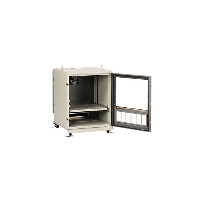 いろいろな用途で活用いただける多様性モデル。 高さ800mmの防塵ラックです。5μm以上の粉塵を補足する除塵フィルターを介し、排気ファンによって強制的にラック内の熱を排熱します。比較的粉塵の少ない現場に適しています。